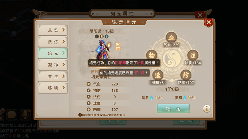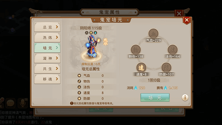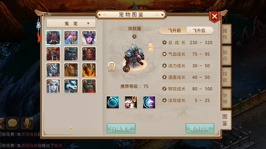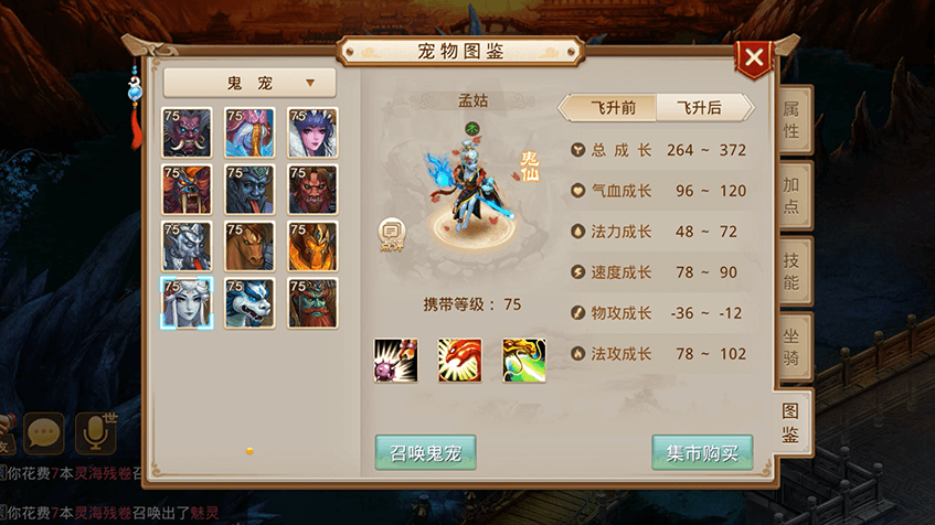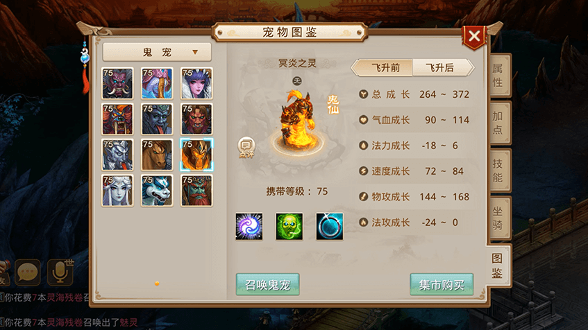 1需要消耗鬼气,可对鬼宠的气血、物伤、法伤、速度、防御进行提升;
