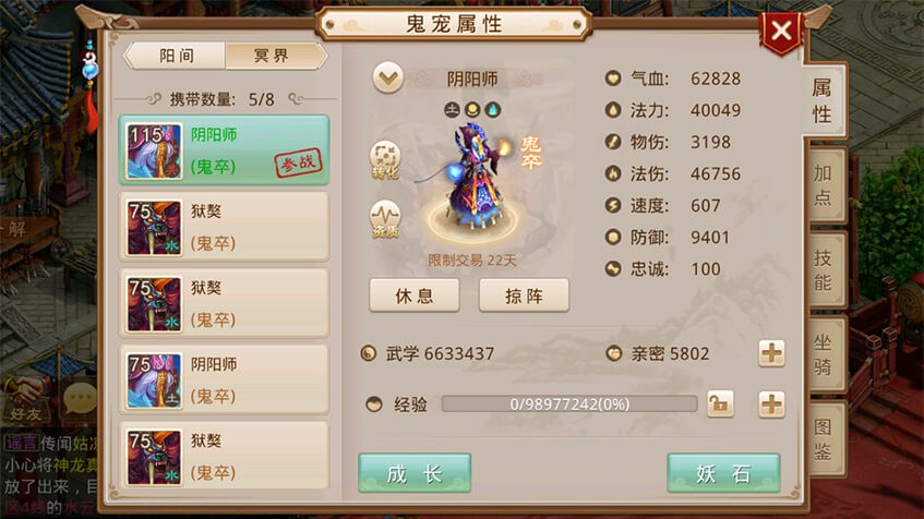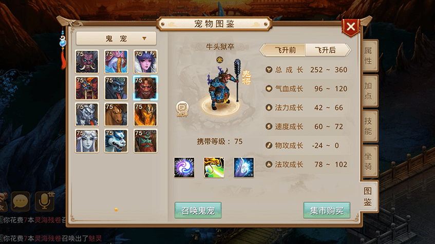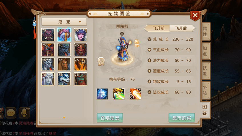 可召唤的鬼宠分为鬼卒、鬼将、鬼仙三种品质,资质如下: