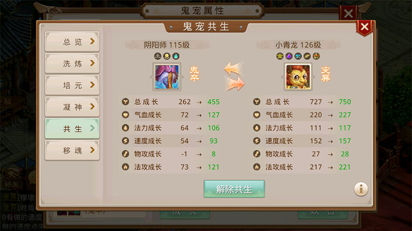 2阳间宠物与鬼宠共生后,阳间宠物根据自身强化、点化、羽化、幻化培养进度为鬼宠提供成长加成,鬼宠根据自身类型及培元进度为阳间宠物提供成长加成;