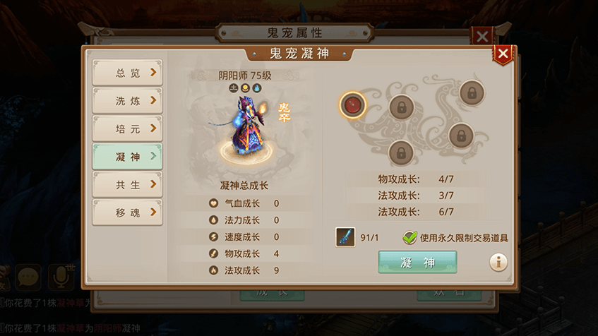 2使用凝神草可随机生成1到3条凝神属性,属性从气血成长、法力成长、速度成长、物攻成长、法攻成长中随机抽取;