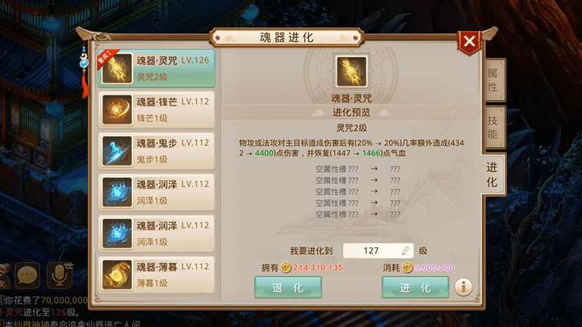 4提升神魂阶数可以解锁魂窍,神魂阶数越高解锁的魂窍属性槽数量越多;