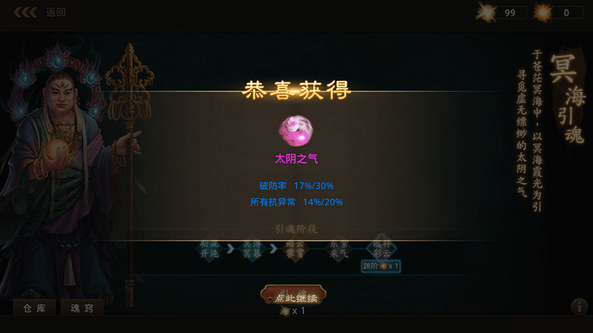 2消耗冥海霞光进行引魂,随机获得太阴之气,每道太阴之气随机附加1到3条属性;